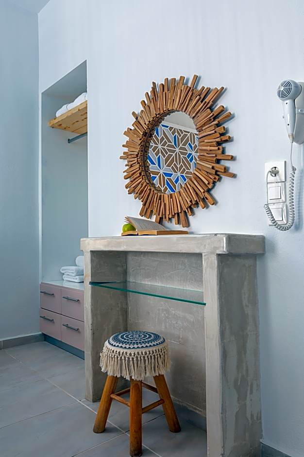 Perched in Merovígli, a private entrance opens to a balcony with landmark Caldera views, setting the stage for a stylish island getaway. Air conditioning and complimentary Wifi keep things comfortable, while a sun deck invites leisurely mornings and golden evenings. An outdoor pool glistens seasonally, offering a refreshing pause just moments from the calm of the village.